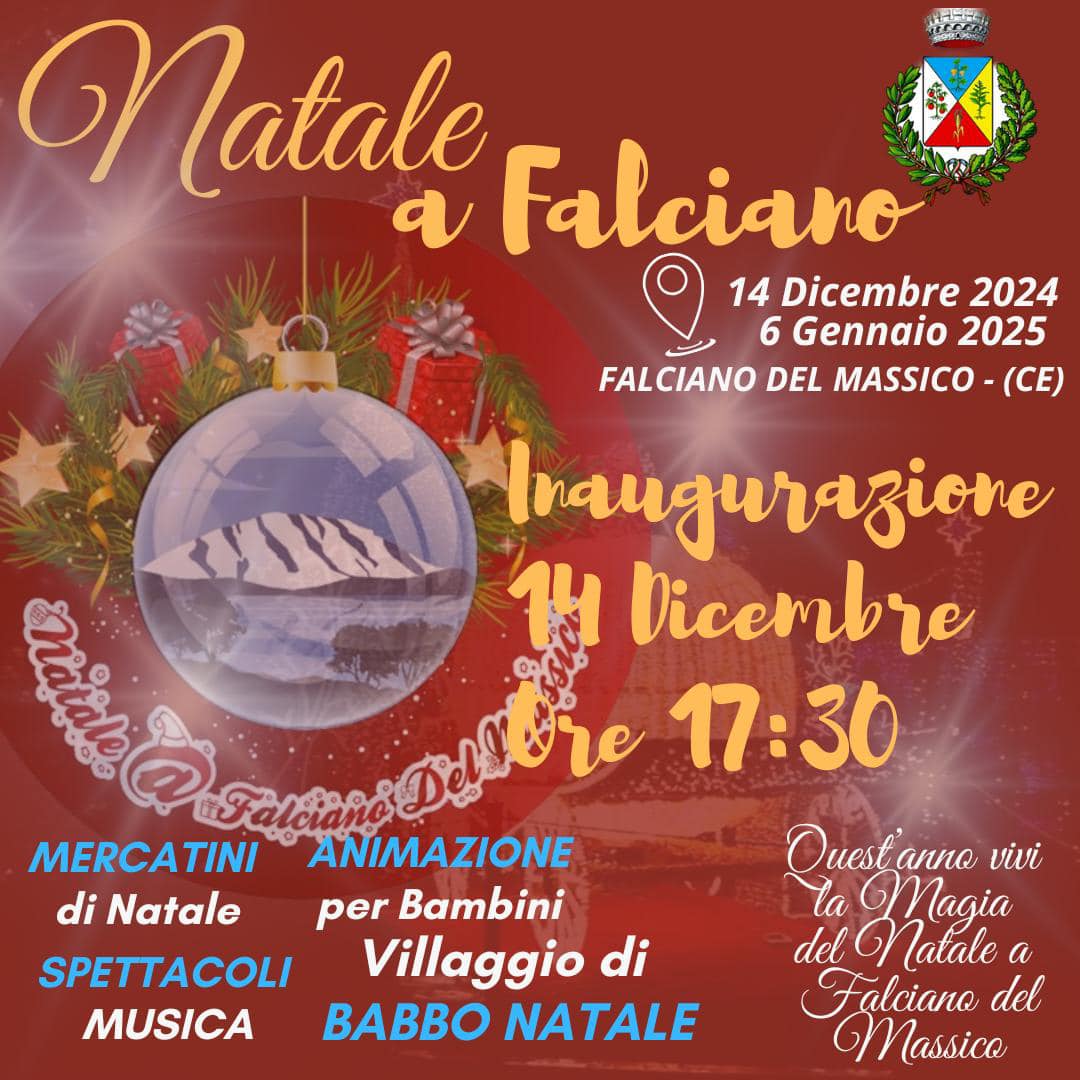 A Falciano del Massico torna "Natale a Falciano", evento diventato un'attrazione provinciale. L'inaugurazione è prevista per il 14 dicembre alle 17:30 presso la Villa Comunale. Il programma include mercatini di Natale, luci d’artista e un villaggio incantato di Babbo Natale con animazione per bambini, attivo fino al 6 gennaio 2025.